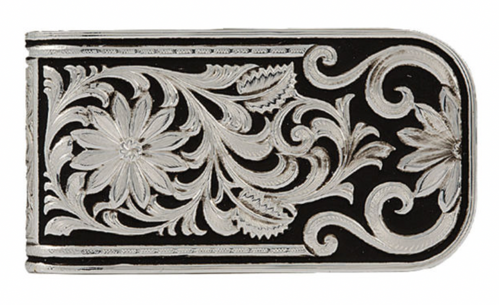 From the Leather Cut Collection this square-ish money clip has a Bitterroot flower and leave design. The detail in this clip is extreme from the many petaled flowers, to the jagged edges of the leaves, which is further illuminated through the precisely hand-painted black background.