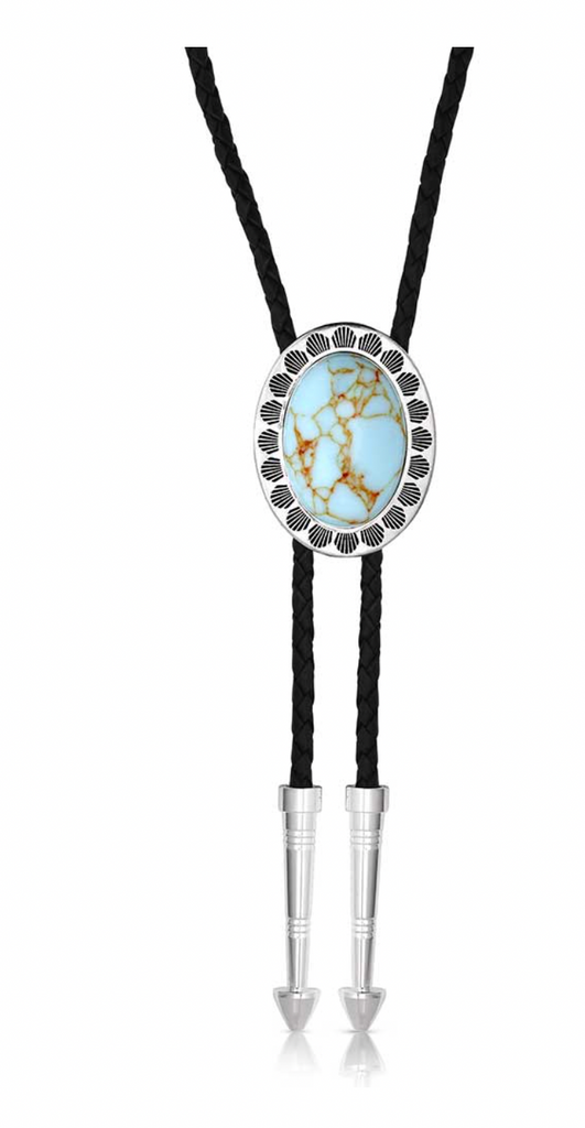Elevate your style with the Turquoise Waters Bolo Tie. This bolo tie features a stunning oval shaped light turquoise stone. A silver tone border with simple etching encircles the turquoise stone. The black braided leather cord is nicely weighted with two silver tone arrow pointed tips. Stone color will vary.
