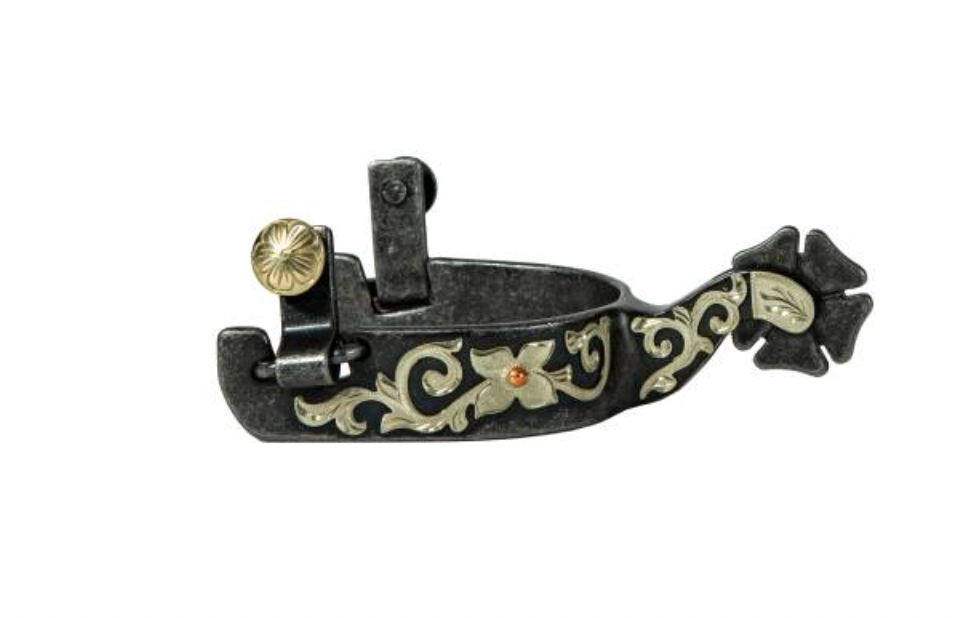 This antique spur features a floral design with silver and copper accents. The 1” band spur is finished with a cloverleaf rowel.