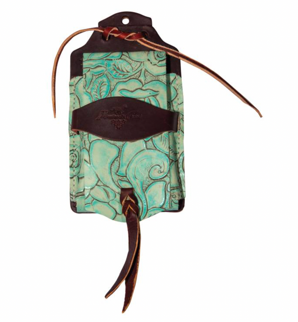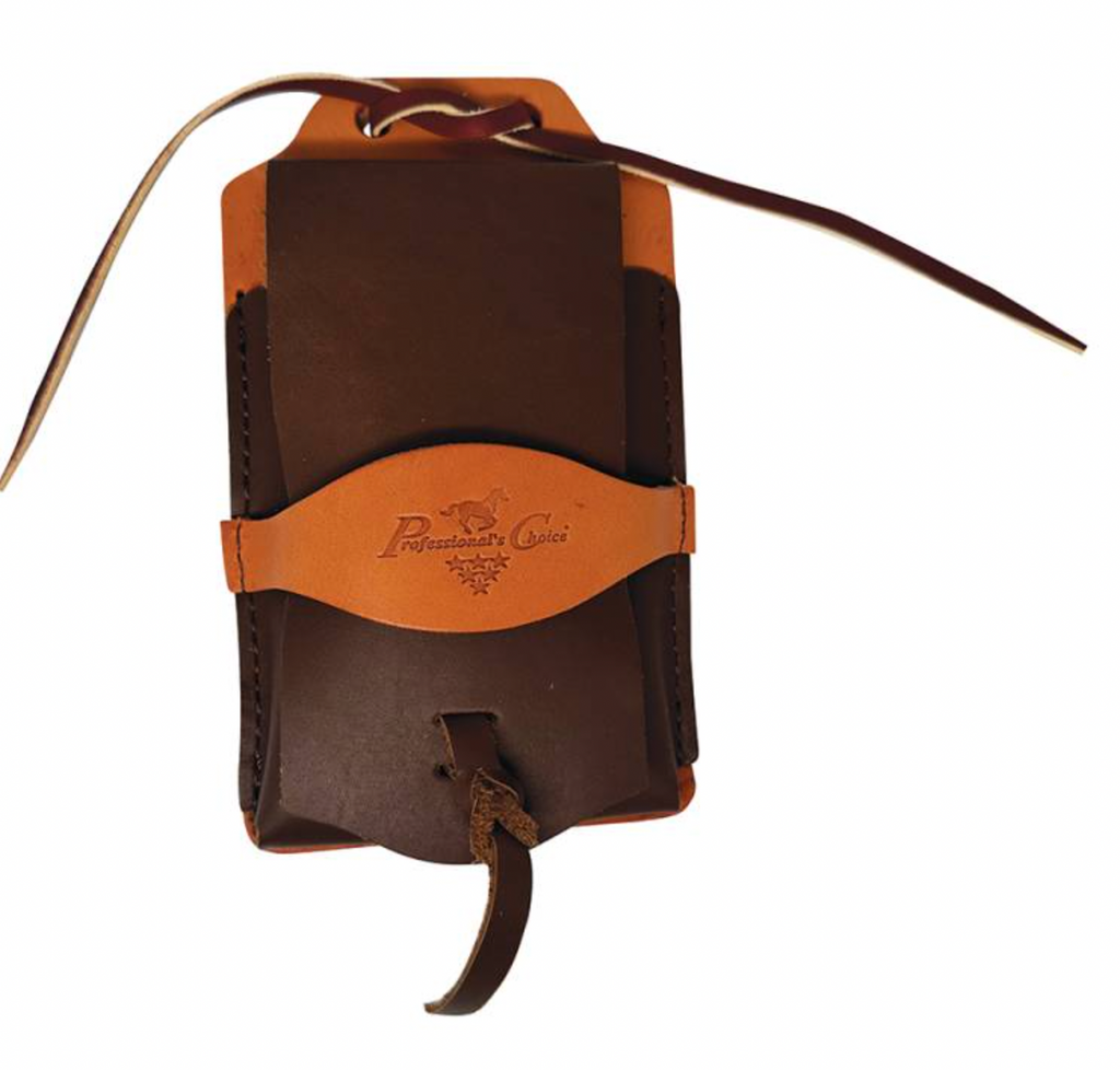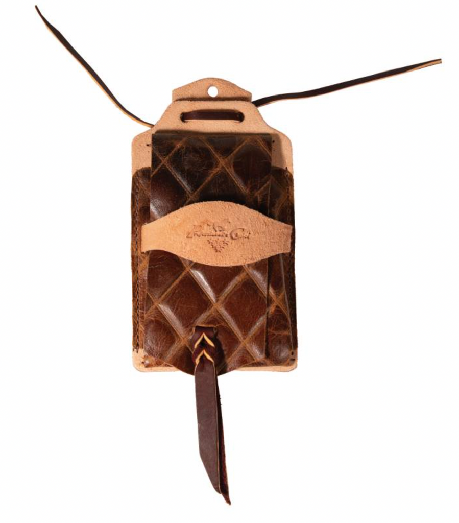 Assorted color soft leather cell phone cases attach to the rear flank cinch of the saddle.