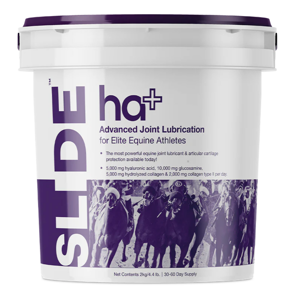 Power packed with the highest amounts of hyaluronic acid, SLIDE™ha+ is the ultimate equine joint supplement available on the market today. A palatable powder that horses will eat right up; two scoops, twice daily(recommended serving for race and performance horses) provides your horse with an incredible 5,000 mg of high molecular weight hyaluronic acid, 5,000 mg of glucosamine hydrochloride (HCL), 5,000 mg of N-acetyl glucosamine, 5,000 mg of hydrolyzed collagen and 2,000 mg of collagen type II PER DAY. Specifically developed for maximum equine joint support, SLIDE™ ha+ helps ensure peak athletic performance and joint protection across all performance horse disciplines, including racing, jumping, reining, cutting, barrel racing, roping, hunter, dressage and eventing.