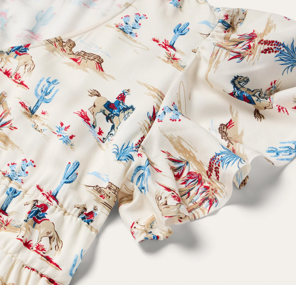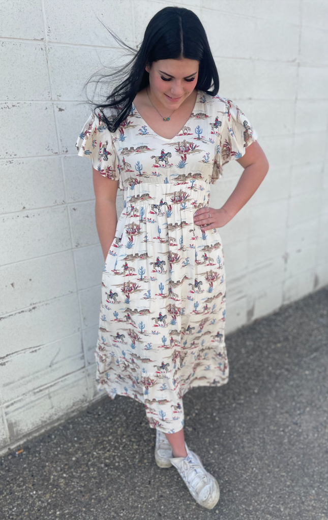 This stylish v-neck prairie dress is crafted from high-quality 100% rayon twill, which has a smooth, silky feel and features our western-inspired Desert Trail print. It has gathers at the shoulders and flutter ruffle short sleeves, two rows of elastic at empire and waits, large ruffle at bottom of hem and side seam pockets. Cut with an easy, flattering drape, that allows for all-day comfort and freedom of movement.