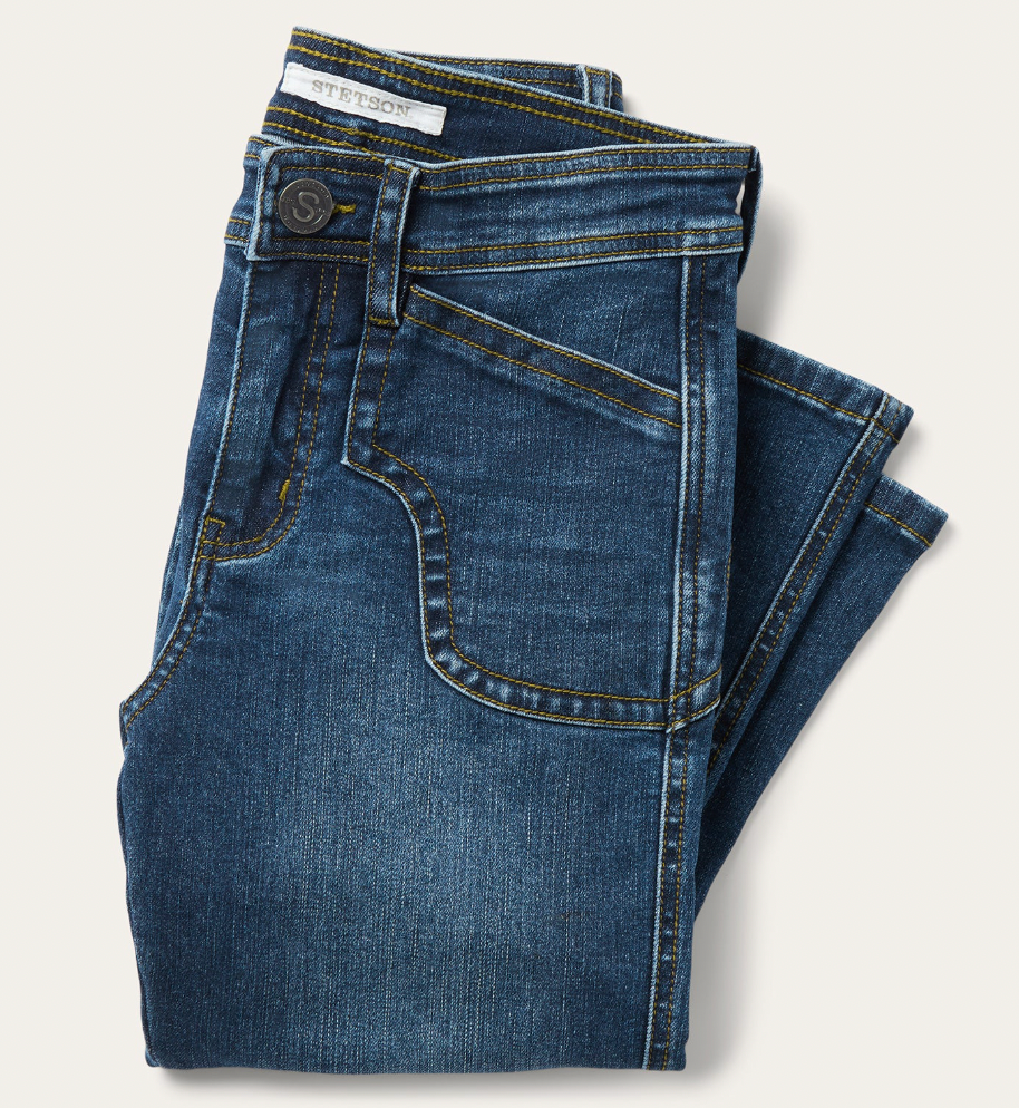 The 921 High Waist Flare Fit Jean is crafted from premium stretch denim for comfort, structure, and a flattering silhouette. With a slim fit through the thigh and knee and a flare leg opening, it delivers a classic western look with bold, feminine shape. Stylized western line details on the curved hip yoke and front patch pockets add subtle character, while the plain back pockets keep the profile clean. Finished with Stetson-branded hardware and light sanding for a broken-in feel.