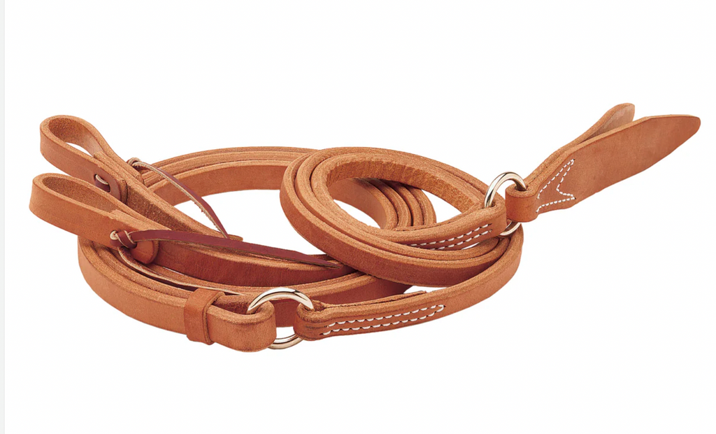 Constructed from rugged, weather resistant Hermann Oak light russet harness leather, these reins have a convenient romal with popper end. Water tie loops with alum tanned laces offer easy replacement. Durable nickel plated hardware. Measure 5/8" x 8.