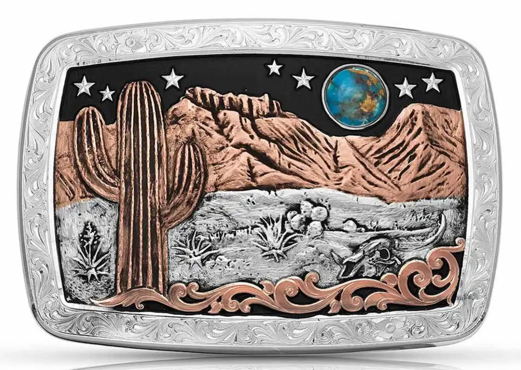 There is something hauntingly lovely about a desert landscape. This buckle seeks to capture all those glorious details into miniaturized form with a large antiqued rose gold Saguaro cactus on the left set to the front of matching color sharply defined desert mountains. A strikingly of bright silver finished stars float their way across the top of the buckle against a deeply black hand-painted background. A round compressed copper turquoise cabochon, like a blue moon, sits off to the right side of the buckle amidst the stars. Farther down the buckle antiqued silver desertscape details of small cacti and agave plants are engraved in exquisite detail. One long antiqued rose gold single scroll starts curling up from the bottom right corner, winding its way across the face of the buckle and trails off in a tendril, just past the Saguaro cactus. A bright silver finished thick edge with bright-cut engraving finishes off the design. Standard 1.5 inch belt swivel.
