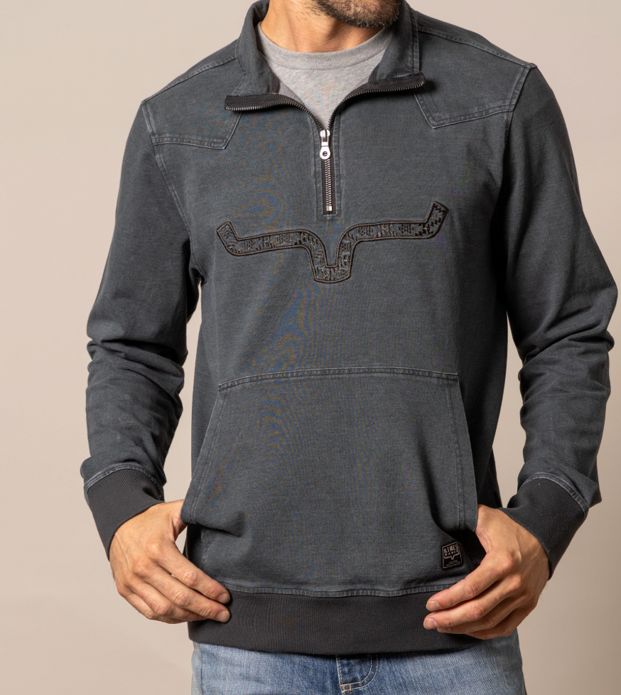 The Rowell Pullover brings modern comfort to classic western design. Crafted from soft French terry with a hint of stretch, this quarter-zip pullover features a distinctive western yoke and a roomy kangaroo pocket for warmth and convenience. The horn design on the chest—subtly filled with a western-inspired pattern—adds heritage appeal without overpowering the look. Versatile and refined, the Rowell transitions seamlessly from casual outings to polished everyday wear.