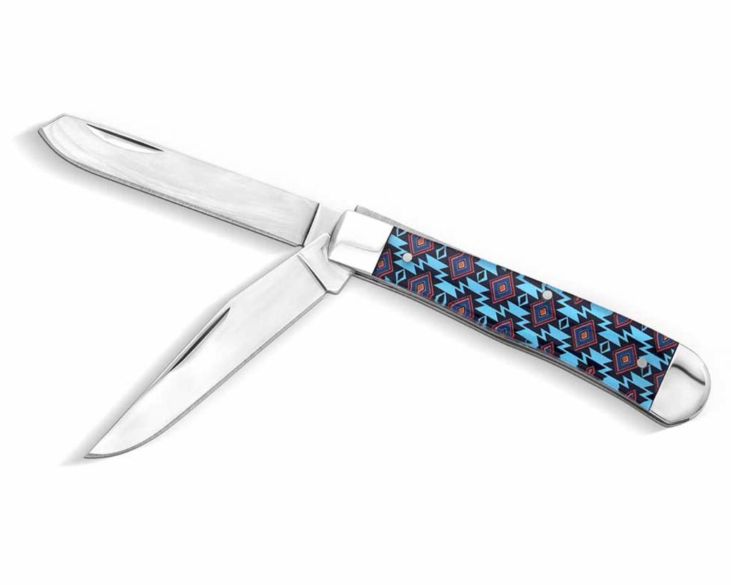 Be prepared for any adventure and look stylish at the same time with the Desert Showdown Trapper Knife. This pocketknife features two easily accessible blades. The handle has a blue and orange geometric pattern, adding Southwestern style to the design. The Montana Silversmiths logo Can be seen at the end of the handle. Be the person who is prepared for any task with a convenient and stylish pocketknife.