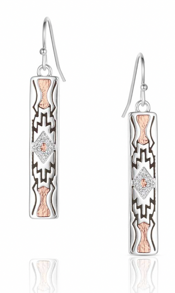 Silver tone bars adorned with rose gold and black painted patterns running through the center. At the heart of each earring, a diamond-shaped detail sparkles with clear crystals, adding just the right amount of shine. Finished with French wire hooks for easy, graceful wear, these earrings are a perfect standalone statement or a striking companion to the Golden Horizon Bar Necklace.