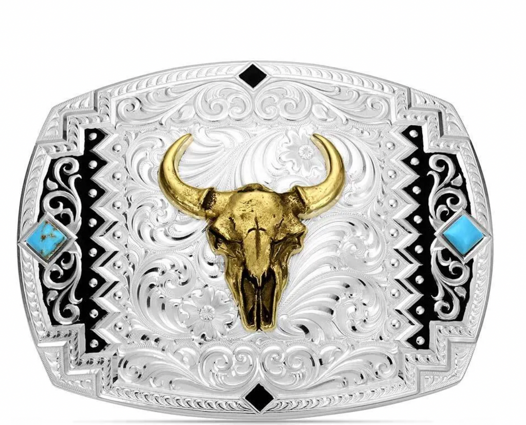 Powerful, iconic, and deeply connected to the land. TheSouthwest Scroll Buckle with Buffalo Skull centers around a bold buffalo head, an enduring symbol of strength and resilience. Every detail honors the rugged beauty of the west, making this buckle a true statement piece for those who carry the West in their soul. Standard 1.5 inch belt swivel. Stone color may vary.