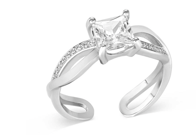 The Dazzle and Delight Crystal Ring features a stunning large square cut cubic zirconia stone at the center, securely held by four prongs. The band is elegantly designed with two strands, one being smooth silver and the other adorned with sparkling cubic zirconia crystals, creating a beautiful contrast. With its open back design, this ring is adjustable to fit most sizes, making it a versatile and dazzling statement piece.