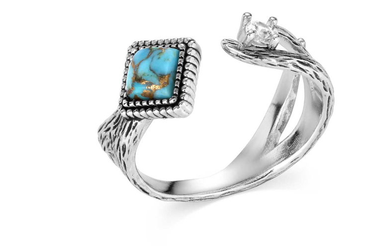 The Rugged Beauty Turquoise Ring is where rustic style meets refined detail. A silver tone antler design forms the open front band. One end features a square turquoise stone, while the other holds a sparkling cubic zirconia crystal. Stone color may vary.