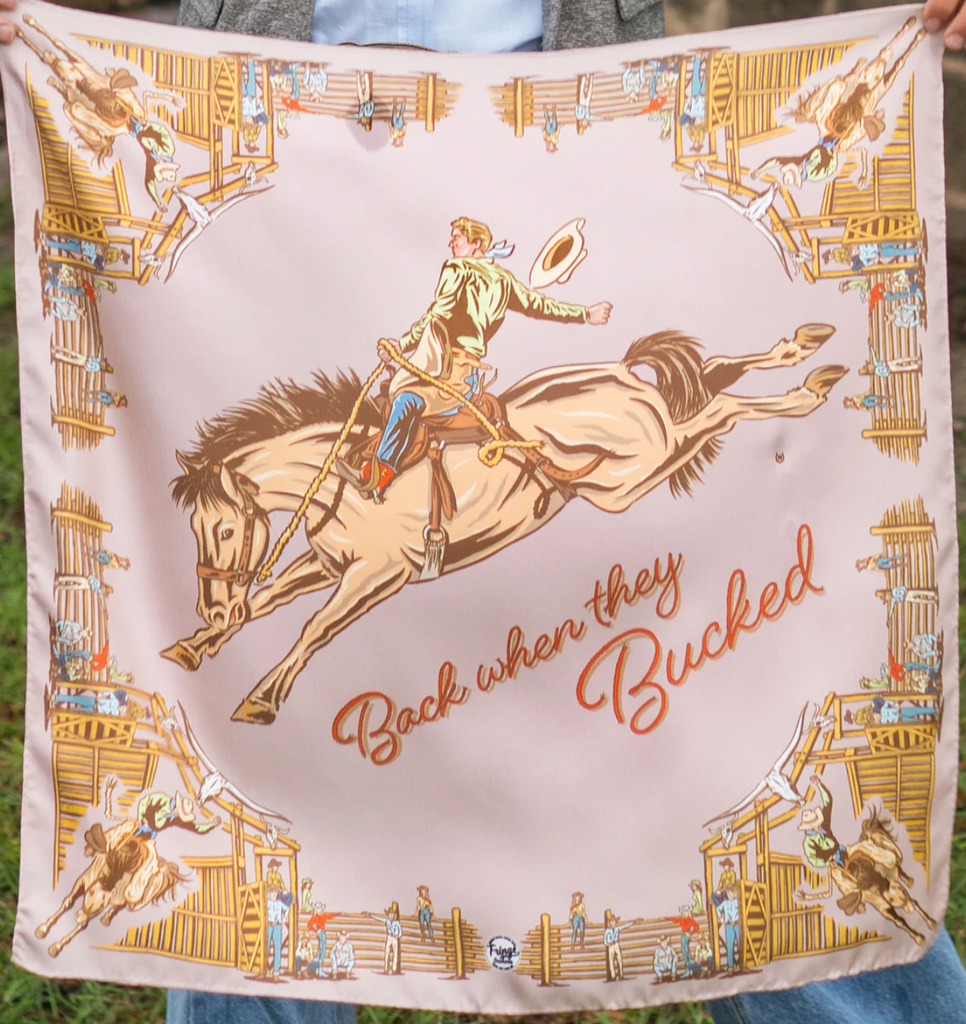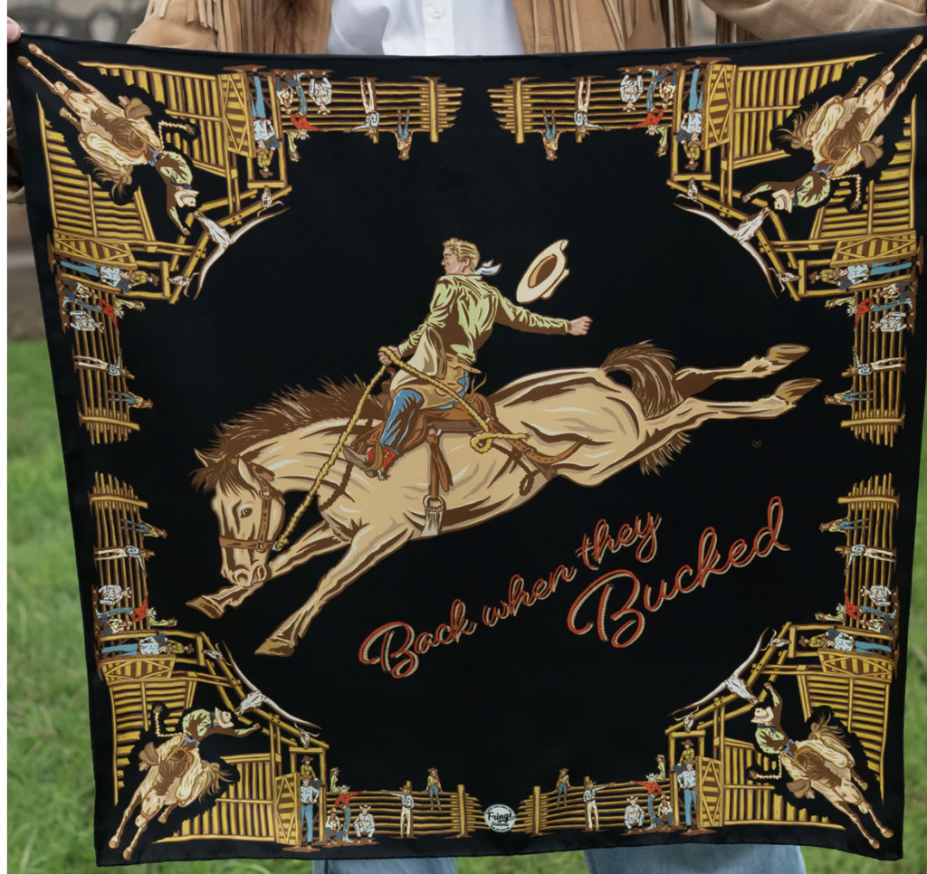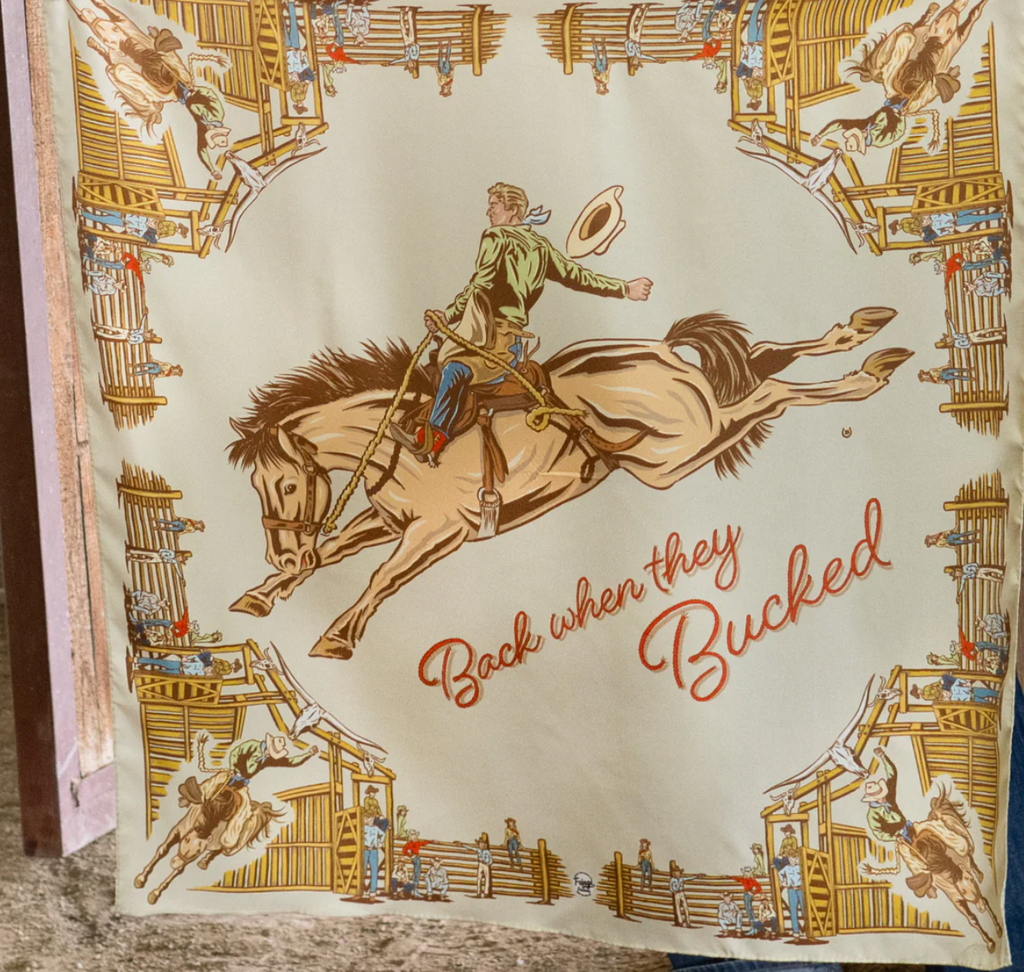 Back When They Bucked is a tribute to the rodeo’s golden era—think 1940s–50s bronc riders, bucking chutes, and mid-century swagger. With its hand-drawn details and classic composition, this scarf captures the spirit of a time when the arena was raw, rowdy, and full of glory. A must-have for collectors who appreciate tradition with bold style.