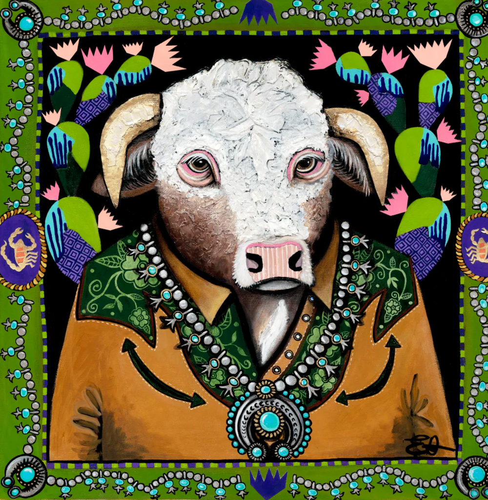 Bull in Bloom is inspired by her family’s farm in Waxahachie, Texas and features a richly textured Hereford bull with a striking red coat, curly white face, and a squash blossom necklace. This collector’s piece brings Western roots to life in Elizabeth’s signature mixed media style, making it a standout addition to any wardrobe or collection.